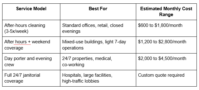 24/7 janitorial services cost more, but the premium varies significantly depending on how the coverage is structured. If you add a daytime porter to an existing evening cleaning contract, you're typically looking at an added $1,200 to $2,500 per month for a dedicated part-time porter in a mid-size building. Fully staffed, around-the-clock coverage for a large commercial property can run considerably higher.