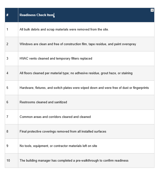 You’re three days out from your final walkthrough. The tile work is done, the fixtures are in, and the subcontractors have cleared out. You feel good. Then the inspection happens, and the building inspector flags the site for debris, concrete dust on electrical panels, and construction film on every window. You’ve just added a week to your project timeline, and the building manager is not happy.