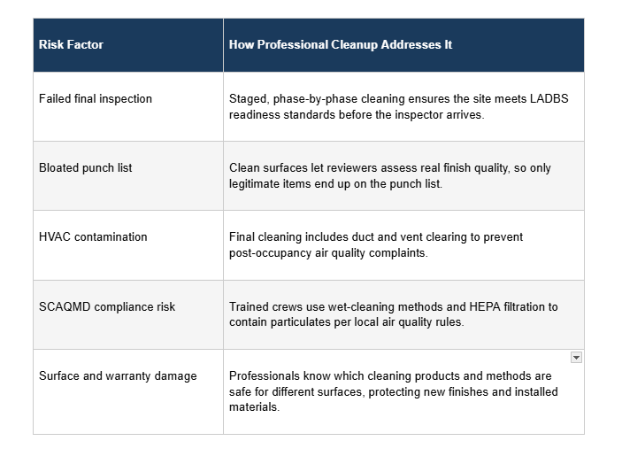 Professional construction cleanup services in Los Angeles do several things that directly reduce project risk: