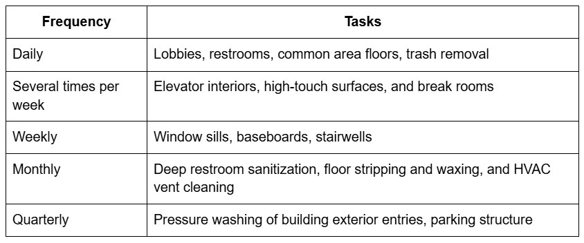 The specific frequency depends on traffic volume and building type. A 50-person office suite in Pasadena has different needs than a 200,000 square foot multi-tenant tower in downtown Los Angeles. But the principle is the same: scheduled and consistent beats reactive every single time.