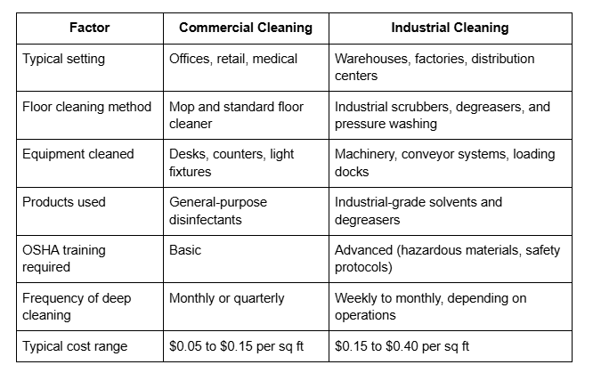 If you manage a warehouse in Los Angeles, you have probably called a cleaning company, described your space, and received a quote. The crew arrived, cleaned the floors, emptied the trash cans, wiped down the break room, and then left. It looked okay on the surface. But a few weeks in, you noticed the grease stains were back near the loading dock. The concrete floors smelled like chemicals and motor oil. The restrooms were clean, but the production area still felt grimy.