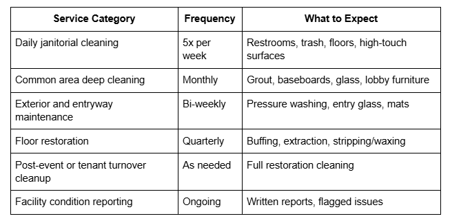 Think floor refinishing, carpet extraction, window cleaning, exterior surface washing, and lobby glass polishing. These are not daily tasks, but they need to happen on a schedule. When they don't, tenants notice before you do.